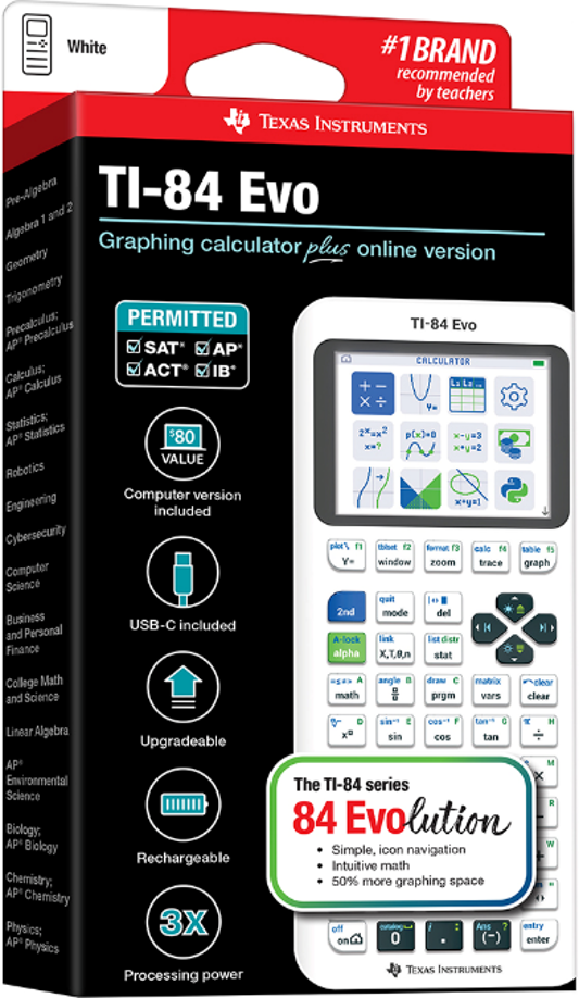 - 1 – TI-84 Evo Calculator with rechargeable battery